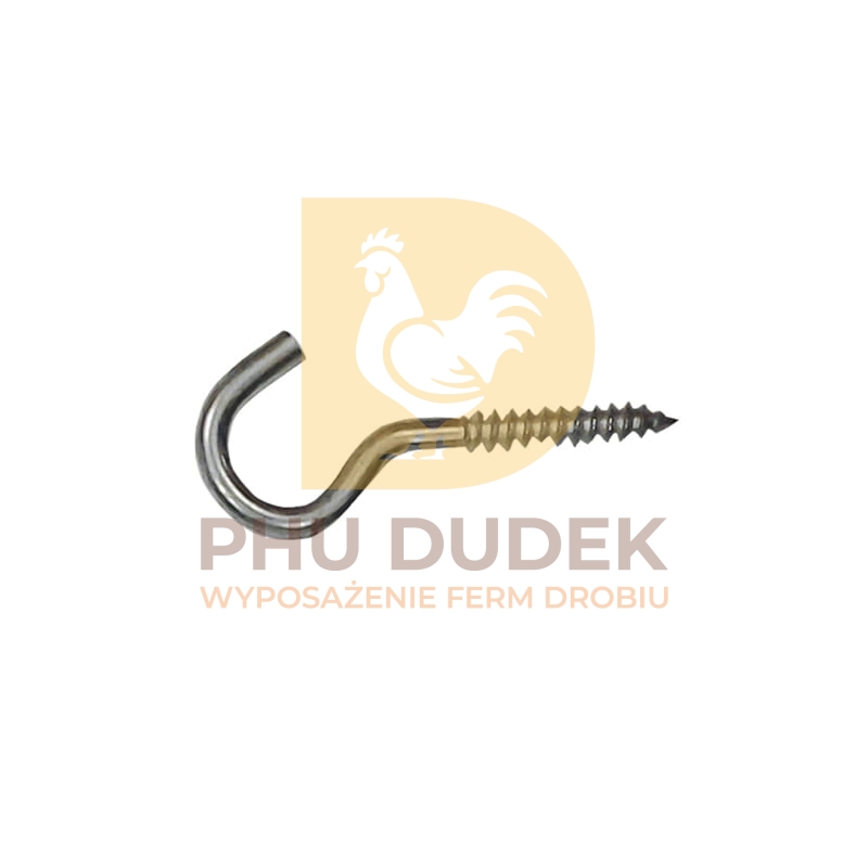 Hak podwieszeniowy 120 mm – stalowy hak galwanizowany, wkręcany do drewna. Stosowany do montażu bloczków w suficie w systemach podwieszeń linii paszowych i pojenia. Dzięki ocynkowanej powierzchni jest odporny na korozję i zapewnia trwałe mocowanie.