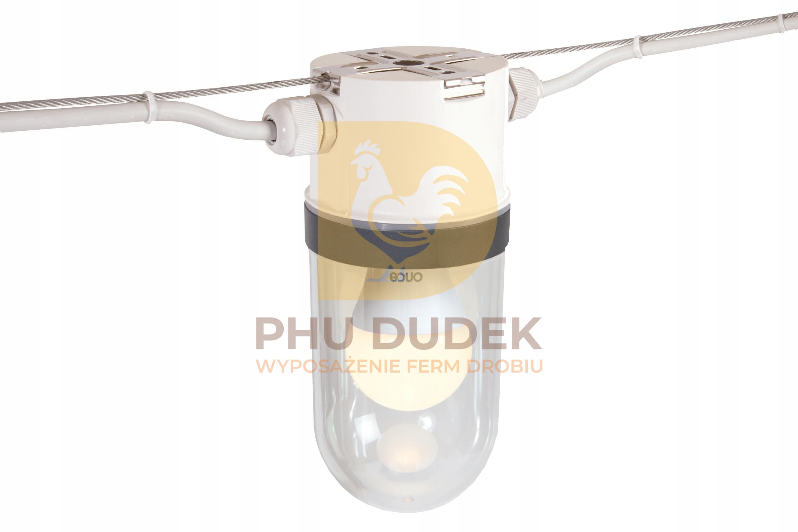 Przezroczysty klosz zapewnia pełną skuteczność oświetlenia, a solidna konstrukcja całego zestawu gwarantuje długotrwałą i bezawaryjną pracę nawet w wymagających warunkach fermowych.