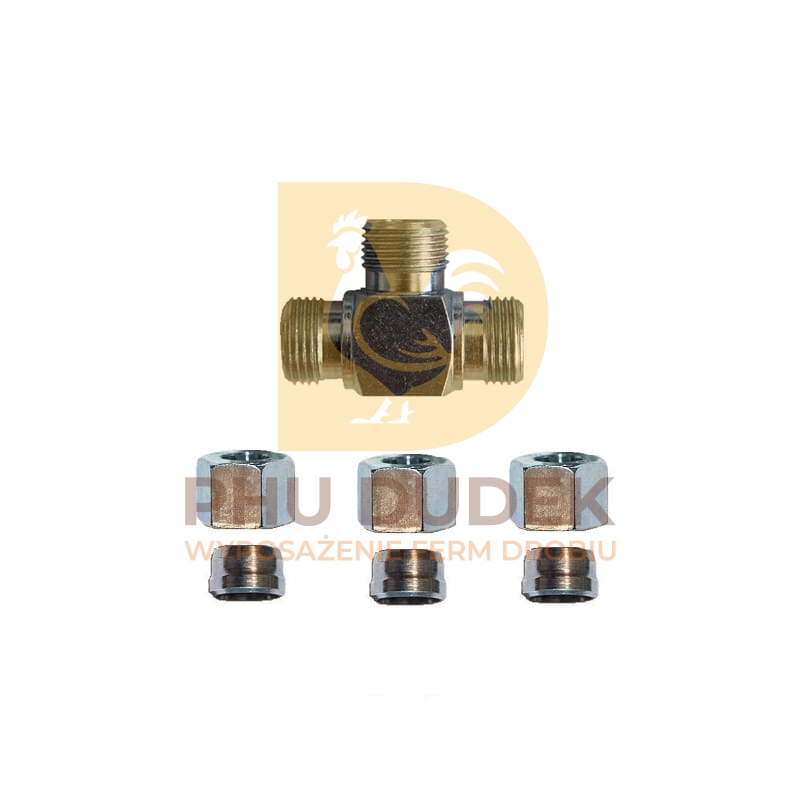Trójnik do zamgławiania skręcany to element złączny systemów schładzania i zraszania, wykonany ze stali nierdzewnej. Umożliwia trwałe i szczelne połączenie rurek poprzez dokręcanie nakrętek z pierścieniami przy pomocy klucza płaskiego. Dzięki solidnej konstrukcji trójnik jest odporny na korozję i przystosowany do intensywnej eksploatacji w warunkach fermowych.