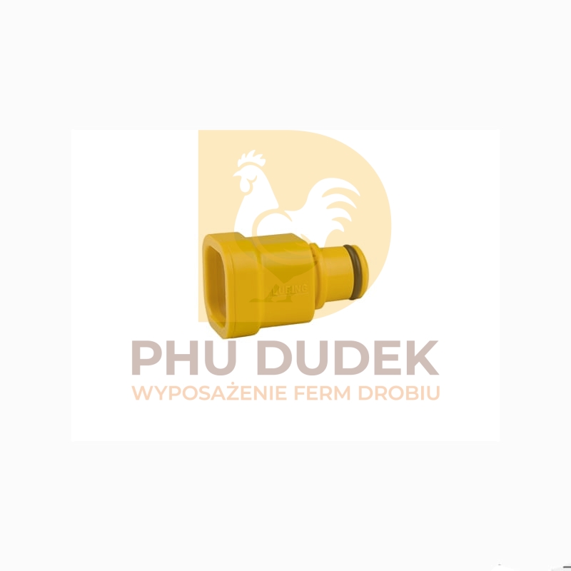 Materiał: wysokiej jakości tworzywo sztuczne; z jednej strony gwint zewnętrzny (1 cal) do reduktora, z drugiej mufowa końcówka do rury kwadratowej